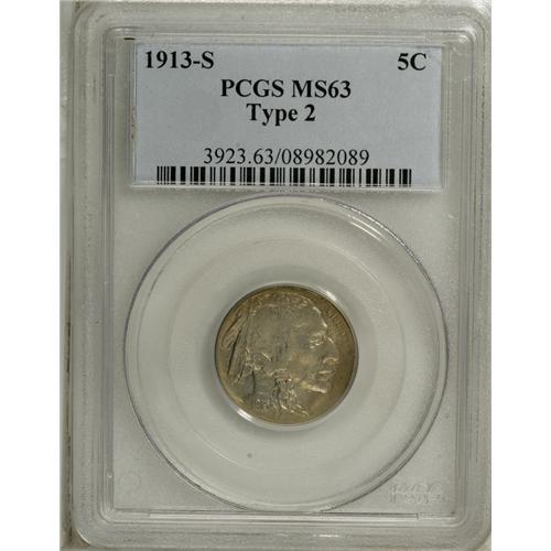 <B>1913-S 5C Type Two MS63 PCGS.</B></I> A scarce issue that is often missing in collections of Buffalo nickels. This piece has pleasing light gray surfaces with peripheral pastel gold toning.<BR><BR><b>Shipping:</b> Coin/Currency (<a target="_blank" href="http://www.heritageauctions.com/common/shipping.php">view shipping information</a>)