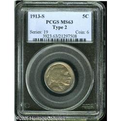 <B>1913-S 5C Type Two MS63 PCGS.</B></I> Gray-gold patination overlays soft luster. Adequately struck, though portions of the Indian's hair are a trifle soft. Lot:5959