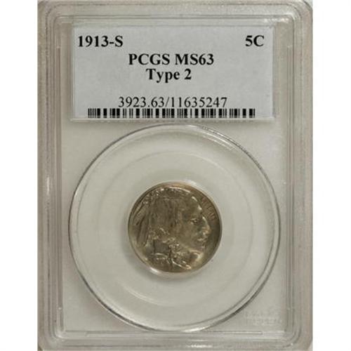 <B>1913-S 5C Type Two MS63 PCGS.</B></I> PCGS Population (280/419). NGC Census: (148/287). Mintage: 1,209,000. Numismedia Wsl. Price for NGC/PCGS coin in MS63: $900. (#3923)<BR><BR><B>Coin Engraver:</B> James E. Fraser<BR><BR><b>Shipping:</b> Coins & Currency (<a target="_blank" href="http://www.heritageauctions.com/common/shipping.php">view shipping information</a>\)