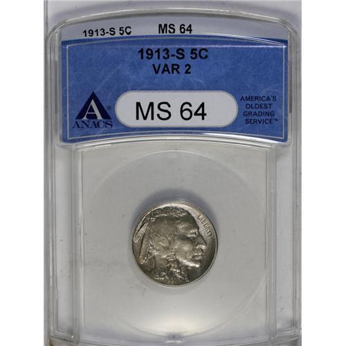 <B>1913-S<5C> Type Two MS64 ANACS.</B></I> A blended ice-blue and green-gray near-Gem. Nicely struck save for the customary minor softness in the centers and on the tail. Among the lowest mintage issues of the series.