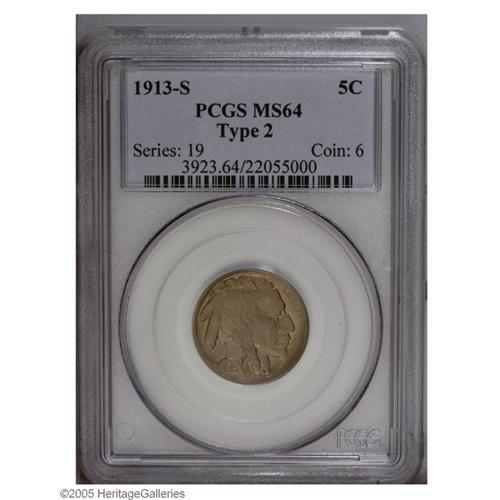 <B>1913-S<5C> Type Two MS64 PCGS.</B></I> A pleasing representation of this key, first-year Buffalo. The gray-gold surfaces exhibit little of the often-seen striking weakness around the peripheries, save for the tops of the letters in LIBERTY. Free of significant contact marks or spots.