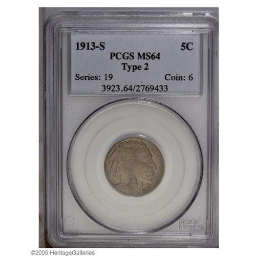 <B>1913-S<5C> Type Two MS64 PCGS.</B></I> Dusky gray-olive patina, the obverse is not completely struck up on this scarcer early Buffalo. Several russet toning streaks diagonally bisect the reverse. The luster is satiny, and neither side reveals even one surface disturbance, however tiny. An impressive near-Gem example of this first year Buffalo nickel variety.