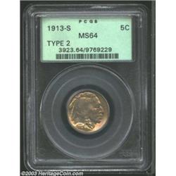 1913-S 5C Type Two MS64 PCGS. Off center swirls of near-brilliance are seen around the centers with.