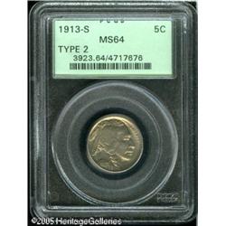 <B>1913-S 5C Type Two MS64 PCGS.</B></I> This Choice Mint State example has satiny luster with pale gold toning over light nickel-gray color. Lot:5960