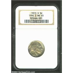 1913-S 5C Type Two MS65 NGC. The scarcest of the six 1913-dated issues in the Buffalo Nickel series, the 1913-S Type Two has a limited original mintage of 1.2 million pieces. This is a simply beautiful coin from the standpoint of originality. Blushes of pastel tinged apricot, golden-gray, and powder-blue iridescence dance over otherwise silver-gray features. The surfaces are uncommonly lustrous for the issue, although we do note some slight incompleteness of strike in the centers. An attractive representative that belongs in an advanced date collection. Important notice: We expect to be auctioning lots at the rate of 200-250 per hour. Sometimes eBay Premier live bid software cannot keep up with that pace, so we strongly recommend that you place a realistic proxy bid now as insurance to avoid disappointment. Also please note that all Heritage/CAA lots purchased through eBay Premier carry a 20% Buyer's Premium. Please make sure you read the Terms and Conditions.