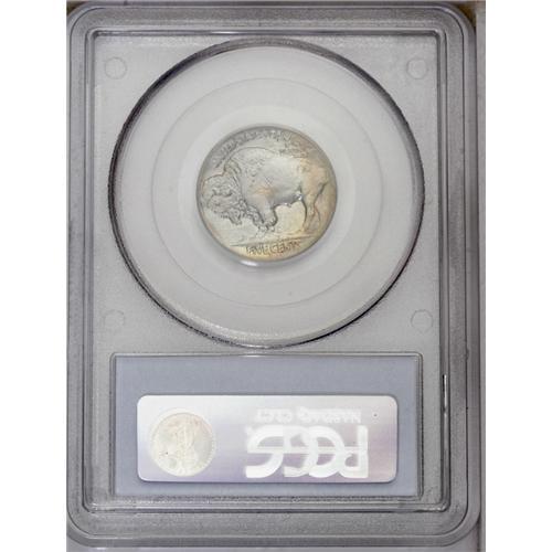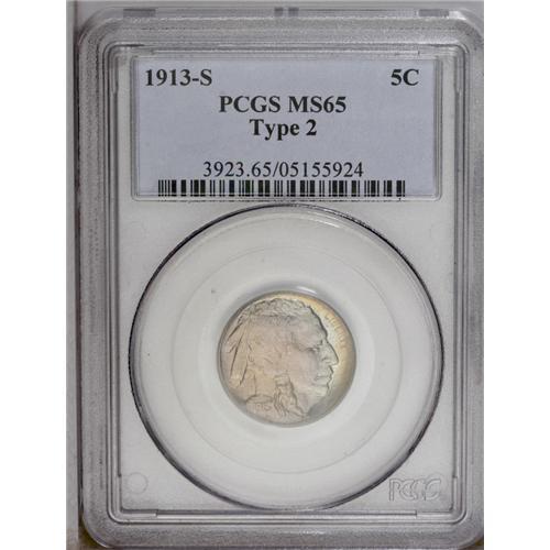<B>1913-S<5C> Type Two MS65 PCGS.</B></I> A highly lustrous example of this scarcer issue from 1913. While showing the peripheral softness common to most Type Two '13-S nickels, this piece has extraordinarily clean surfaces and lovely ice blue and golden toning on each side.