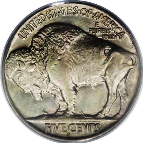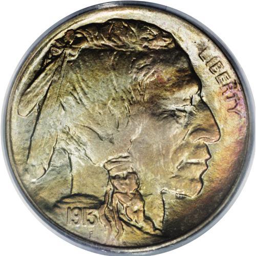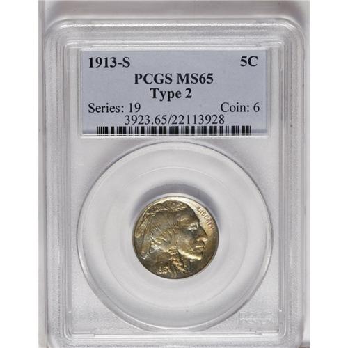 <B>1913-S<5C> Type Two MS65 PCGS.</B></I> A satiny Gem with above average design definition, weak only at the central obverse and reverse areas. Both sides have medium gray color, the obverse enhanced by narrow bands of gold and rose toning. The reverse has subtle iridescent toning in the fields.