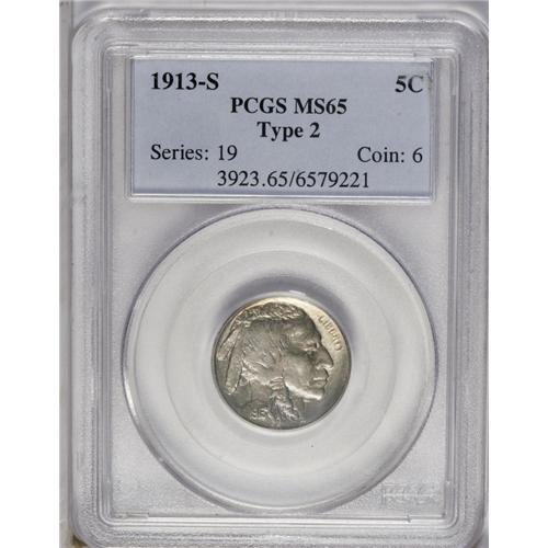<B>1913-S<5C> Type Two MS65 PCGS.</B></I> A satiny Gem with light gray color and pale gold toning highlights. This example has a typical weak obverse with a stronger, more sharply defined reverse. The strike on LIBERTY is average for the date, and the lower hair details just above the top braid are typically weak, but all other design details are quite strong. Population: 88 in 65, 24 finer (7/06).