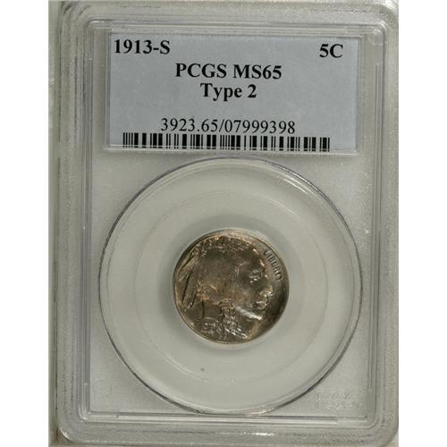 <B>1913-S 5C Type Two MS65 PCGS.</B></I> Generally well struck, if slightly weak above the knot in the Indian's hair braid, as well as on the date and denomination near the lower reverse rim. Typical minor clash marks are observed beneath the Indian's chin. Highly lustrous with lovely electric-blue and rose coloration on both sides. This gorgeous first-year Gem is essentially blemish-free.<BR><BR><b>Shipping:</b> Coin/Currency (<a target="_blank" href="http://www.heritageauctions.com/common/shipping.php">view shipping information</a>)