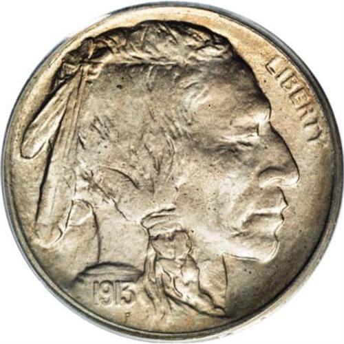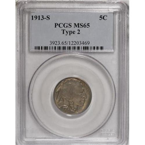 <B>1913-S 5C Type Two MS65 PCGS.</B></I> A remarkable Gem with rich champagne and gold toning over frosty luster. This is a highly appealing representative of the date, despite some tiny spots that are only visible with a magnifier. PCGS has only certified 50 finer examples of the 1913-S Type Two nickel.<BR><I>From The John Stimson, Sr. Collection, Part Two.</B></I><BR><BR><B>Coin Engraver:</B> James E. Fraser<BR><BR><b>Shipping:</b> Coins & Currency (<a target="_blank" href="http://www.heritageauctions.com/common/shipping.php">view shipping information</a>)