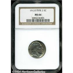 <B>1913-S<5C> Type Two MS66 NGC.</B></I> One of the key dates to the Buffalo nickel series. This is a superior example with a bold strike and a somewhat glossy surface appearance. Some of the typical striking anomalies for this date are in evidence, including a clash mark below the Indian's chin, another just left of UNUM on the reverse, and a little striking softness on the bison's head. All of these features are as produced, and do not affect the coin's technical grade. As far as eye appeal is concerned, this Gem does not suffer from any impediments, with glowing, lustrous surfaces which appear pristine, and soft golden color on both sides. Population: 12 in 66, 1 finer (6/04). <BR><BR><B>Important notice:</B> Heritage usually auctions material at the rate of 200-250 lots per hour. On some occasions eBay Live bid software or the Internet may not be able to keep up with the pace of the auction. We recommend placing a realistic absentee bid now as insurance to avoid disappointment. Occasionally the auctioneer may eliminate or reject an eBay Live bid, and the auctioneer may also reopen a lot after the close of the eBay live bidding (usually because we missed an audience bid), and may reject your bid even if it shows you as the winning bidder. By bidding via eBay Live, you agree that Heritage may award the lot to another bidder at its sole discretion under the circumstances described above or any other reasonable circumstances. Since eBay bids are not shown to us until we open the lot on the floor, we treat those bids just like floor bids. In most cases the floor responds before the eBay bid is presented to us, due to Internet lag time, so for consistency we have made it a policy that floor bids are always considered first over tie eBay live bids. Also please note that all Heritage lots purchased through eBay Live carry a 20% Buyer's Premium. Please make sure you read the Terms and Conditions before you bid. </span></font></tr></table></td></tr></table>