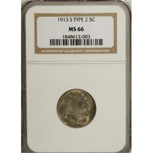 <B>1913-S 5C Type Two MS66 NGC.</B></I> The lowest mintage of the regular-issue nickels of 1913 is represented here by an example of outstanding quality. The luster is soft but remarkably pleasing, and the strike is above-average. Light golden toning accents nearly mark-free surfaces. Census: 20 in 66, 4 finer (6/07).<BR><BR><B>Coin Engraver:</B> James E. Fraser<BR><BR><b>Shipping:</b> Coins & Currency (<a target="_blank" href="http://www.heritageauctions.com/common/shipping.php">view shipping information</a>\)