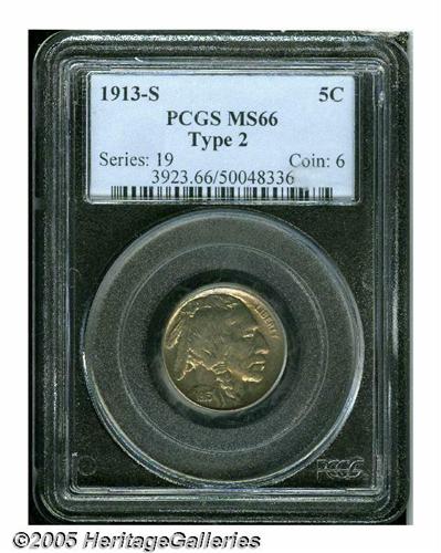 <B>1913-S<5C> Type Two MS66 PCGS.</B></I> A very high grade and colorful example of this scarce early Buffalo Nickel. Sharply struck, the surfaces are bright and highly lustrous with rich, abundant golden-rose toning on each side. One of the finest examples known of the issue and certainly one of the most attractive. Population: 24 in 66, 1 finer (5/05).