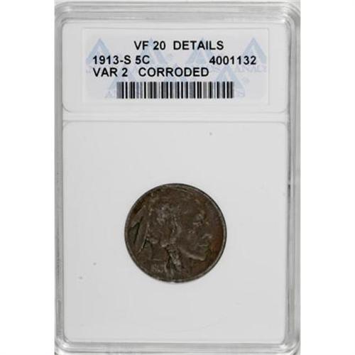 <B>1913-S 5C Type Two--Corroded--ANACS. VF20 Details.</B></I> NGC Census: (17/865). PCGS Population (12/1288). Mintage: 1,209,000. Numismedia Wsl. Price for NGC/PCGS coin in VF20: $358. (#3923)<BR><BR><B>Coin Engraver:</B> James E. Fraser<BR><BR><b>Shipping:</b> Coins & Currency (<a target="_blank" href="http://www.heritageauctions.com/common/shipping.php">view shipping information</a>)
