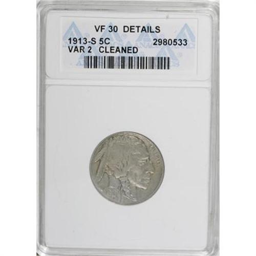 <B>1913-S 5C Type Two--Cleaned--ANACS. VF30 Details.</B></I> NGC Census: (6/866). PCGS Population (17/1285). Mintage: 1,209,000. Numismedia Wsl. Price for NGC/PCGS coin in VF30: $378. (#3923)<BR><BR><B>Coin Engraver:</B> James E. Fraser<BR><BR><b>Shipping:</b> Coins & Currency (<a target="_blank" href="http://www.heritageauctions.com/common/shipping.php">view shipping information</a>)