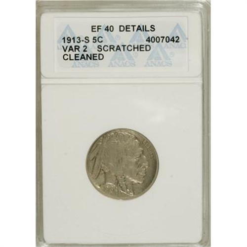 <B>1913-S 5C Type Two--Cleaned, Scratched--ANACS. XF40 Details.</B></I> NGC Census: (15/824). PCGS Population (32/1223). Mintage: 1,209,000. Numismedia Wsl. Price for NGC/PCGS coin in XF40: $408. (#3923)<BR><BR><B>Coin Engraver:</B> James E. Fraser<BR><BR><b>Shipping:</b> Coins & Currency (<a target="_blank" href="http://www.heritageauctions.com/common/shipping.php">view shipping information</a>)