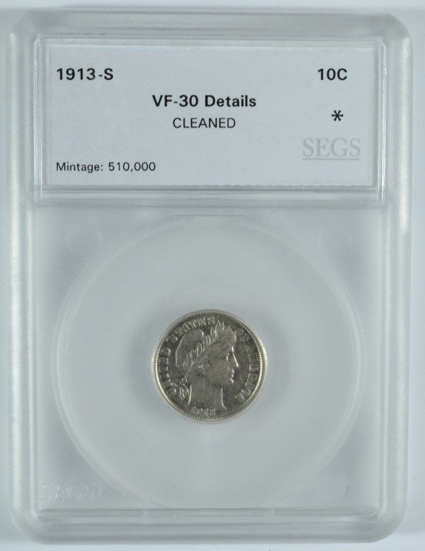 1913-S BARBER DIME, SEGS VF/XF-30 ( cleaned ) RARE!