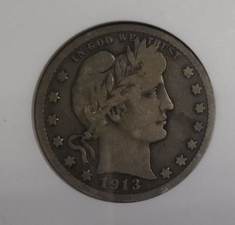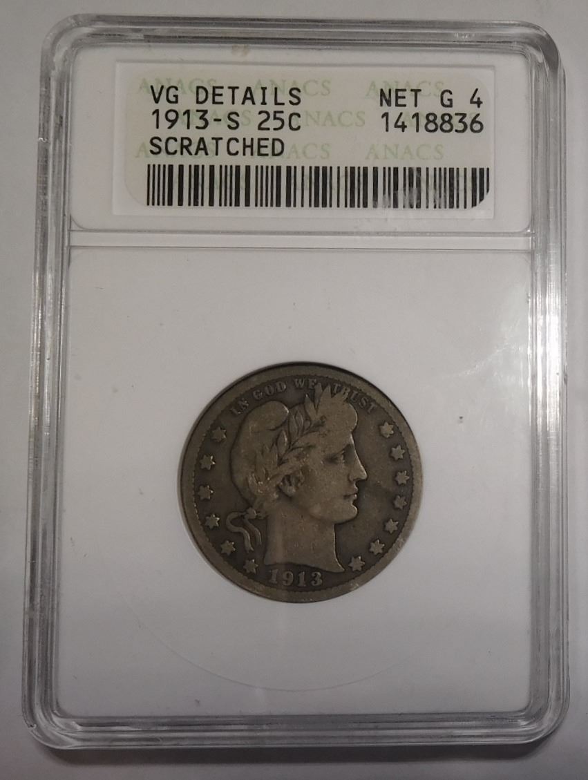 1913-S BARBER QUARTER ANACS VG DETAILS TINY REV SCRATCH NET GOOD-4