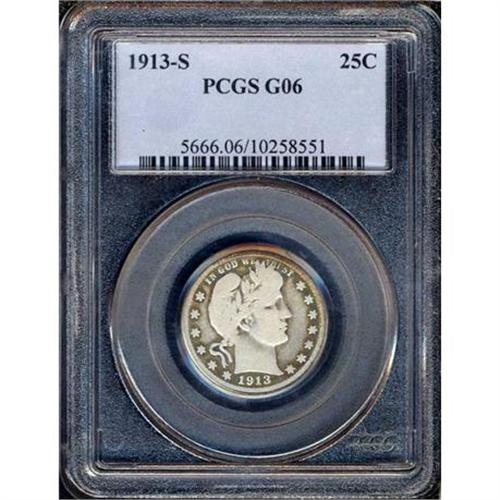 <b>1913-S Barber Quarter Dollar. PCGS graded Good 06.</b> The 1901-S might carry a higher price, but this 1913-S has the lower mintage, in fact, the lowest in the Barber quarter set: 40,000 <b>(PCGS # 5666)</b> <i>