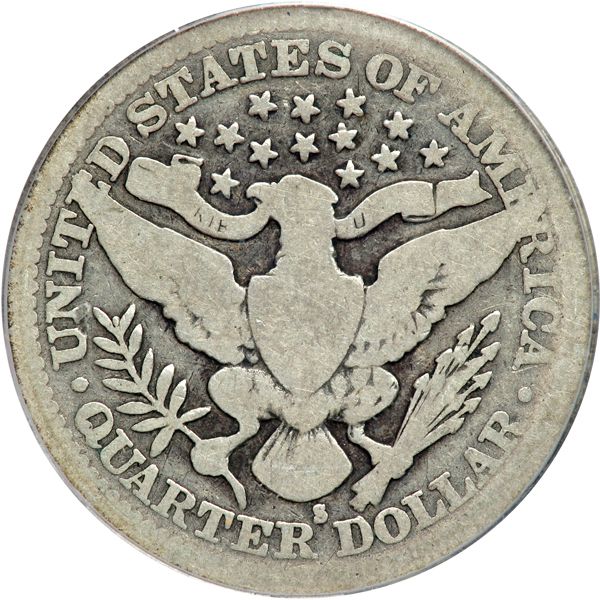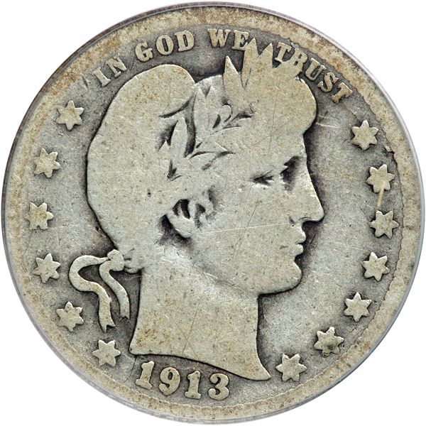 1913-S Barber Quarter Dollar. PCGS graded Good-4. CAC Approved. Complete date and clear mint mark; all, lightly toned. Since there were only 40,000 minted, the 1913-S has the distinction of being one of the rarest Barber quarters in the set. Actively pursued by collectors (PCGS # 5666) .