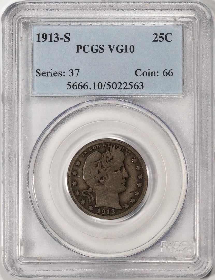 One 1913-S Barber Quarter Coin PCGS VG10. PCGS Graded.