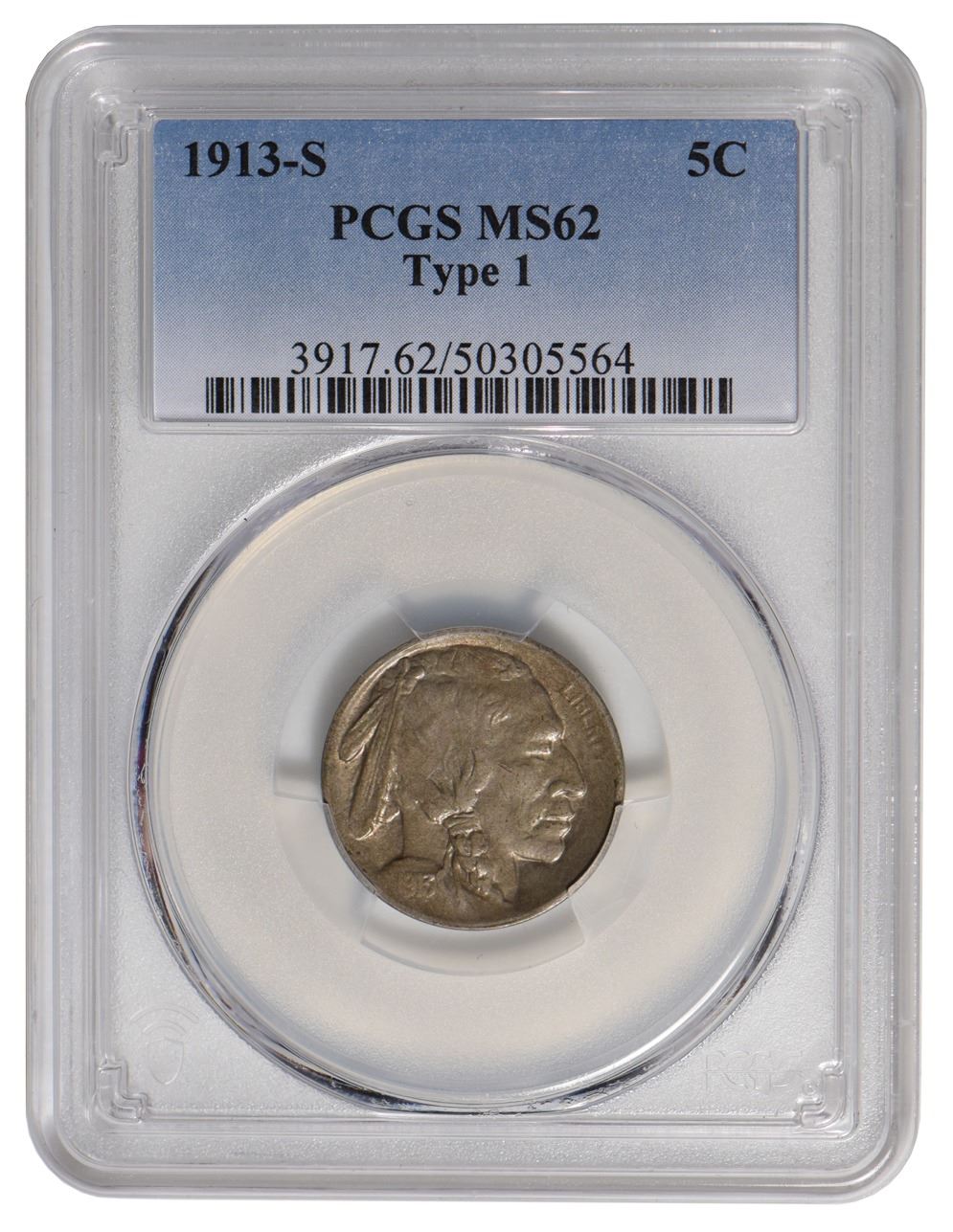 One 1913-S Buffalo Nickel Type 1 PCGS MS62.