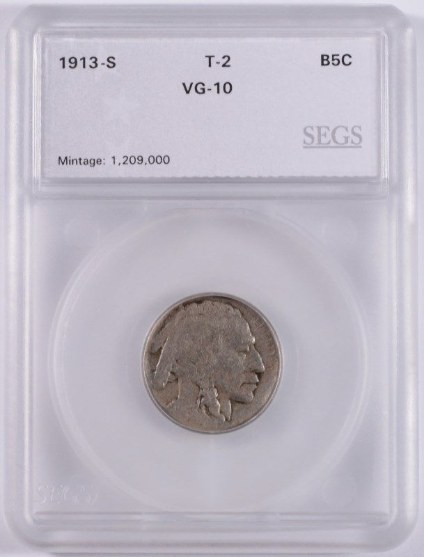 1913-S TYPE-2 BUFFALO NICKEL, SEGS VG-10 KEY!
