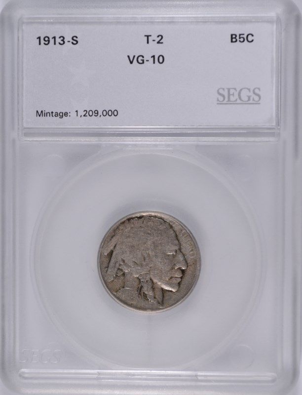 1913-S TYPE-2 BUFFALO NICKEL, SEGS VG-10 KEY!