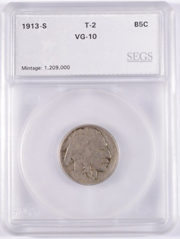 1913-S TYPE-2 BUFFALO NICKEL, SEGS VG-10 KEY!