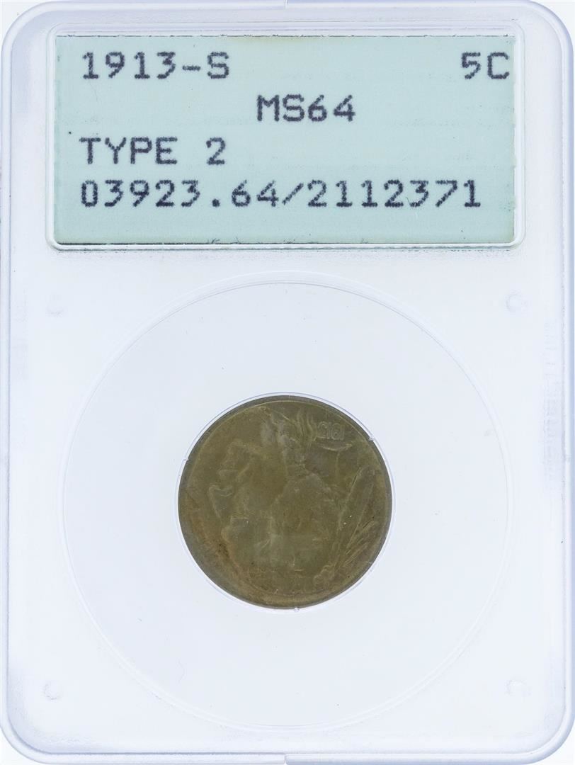 One 1913-S Type 2 Buffalo Nickel Coin PCGS MS64. PCGS Certified.