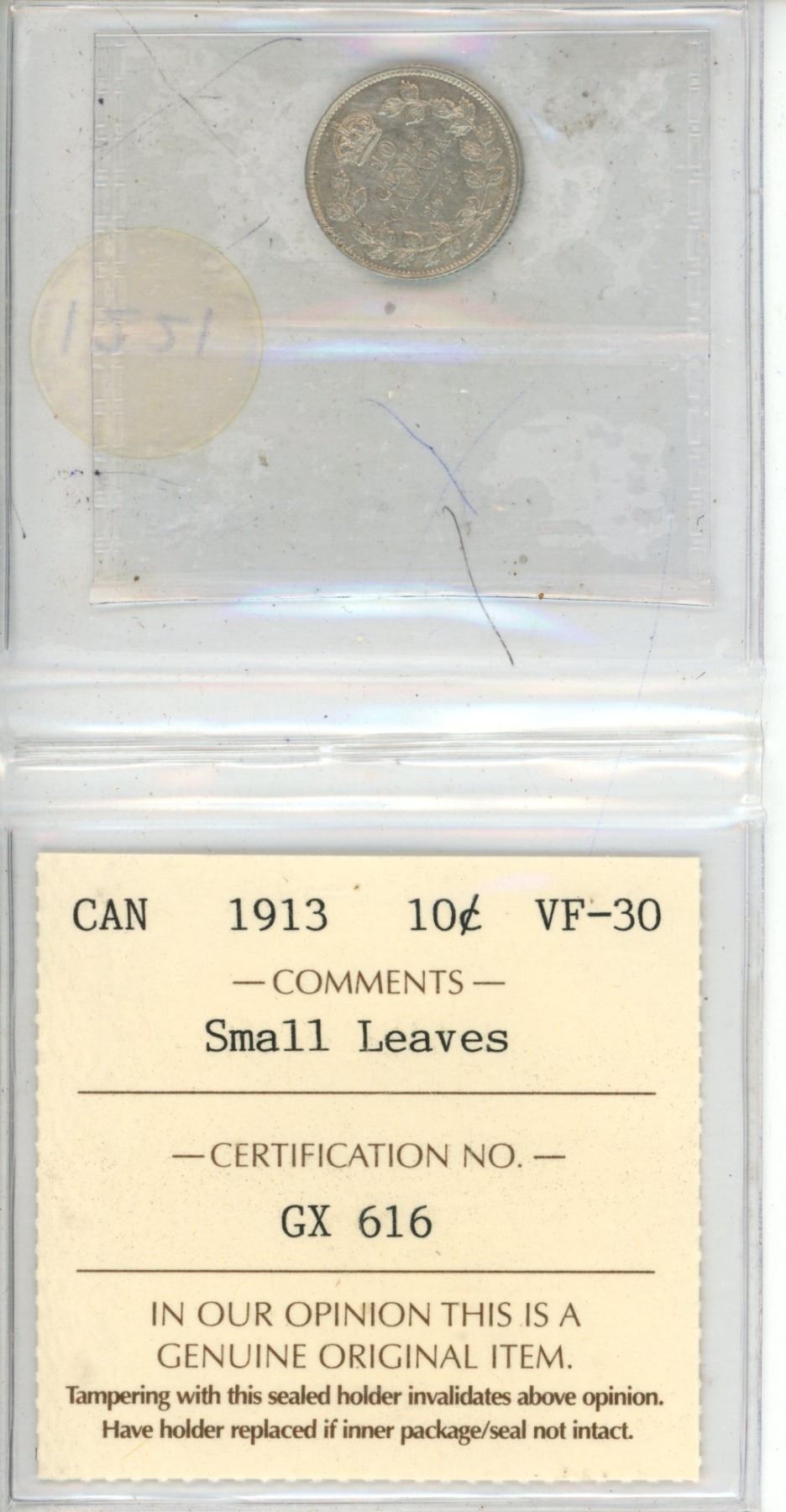 1913 Small Leaves Canadian Silver 10 Cents. ICCS certified and graded VF-30.