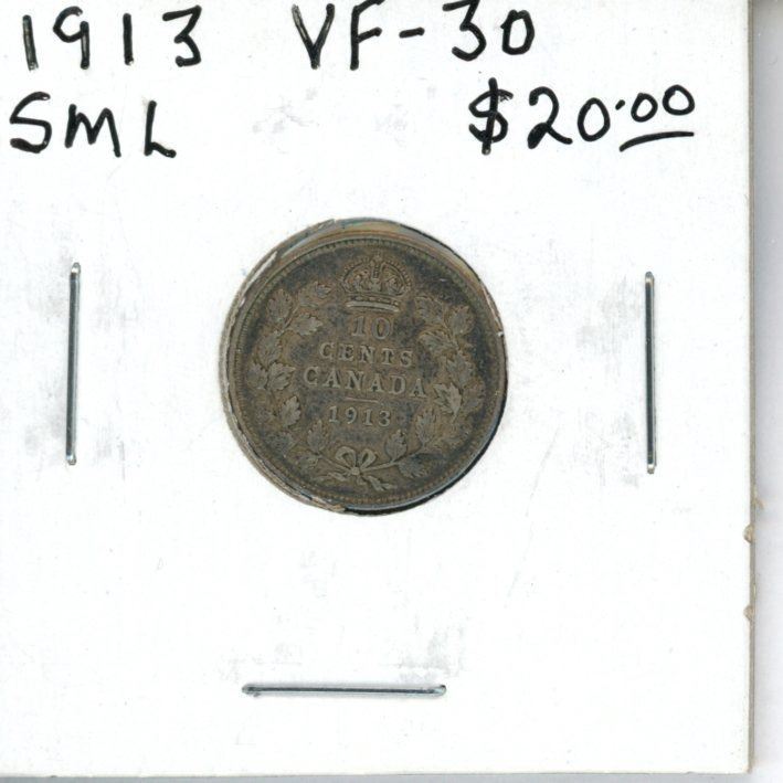 1913 Small Maple Leaves Canadian Silver 10 Cents. VF-30.