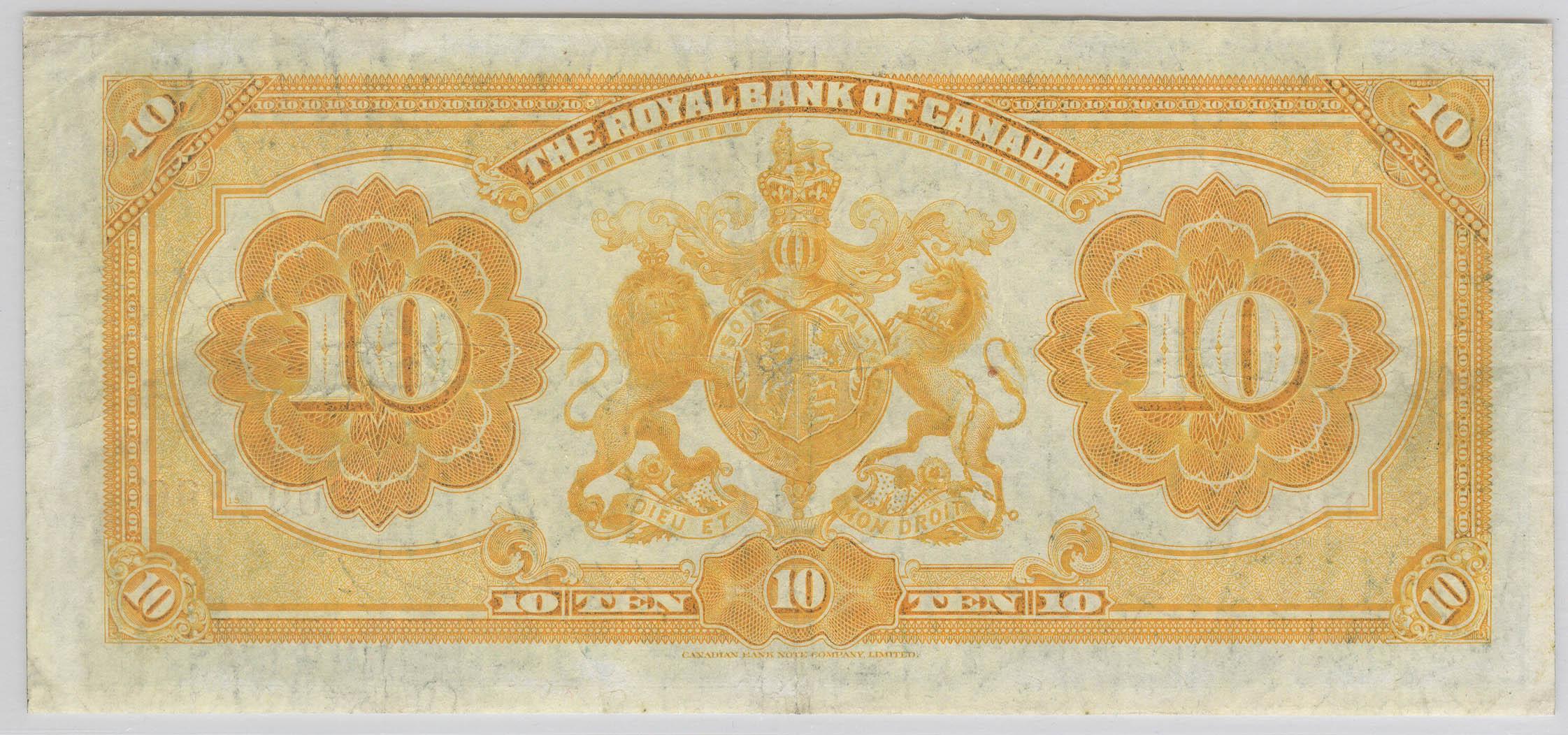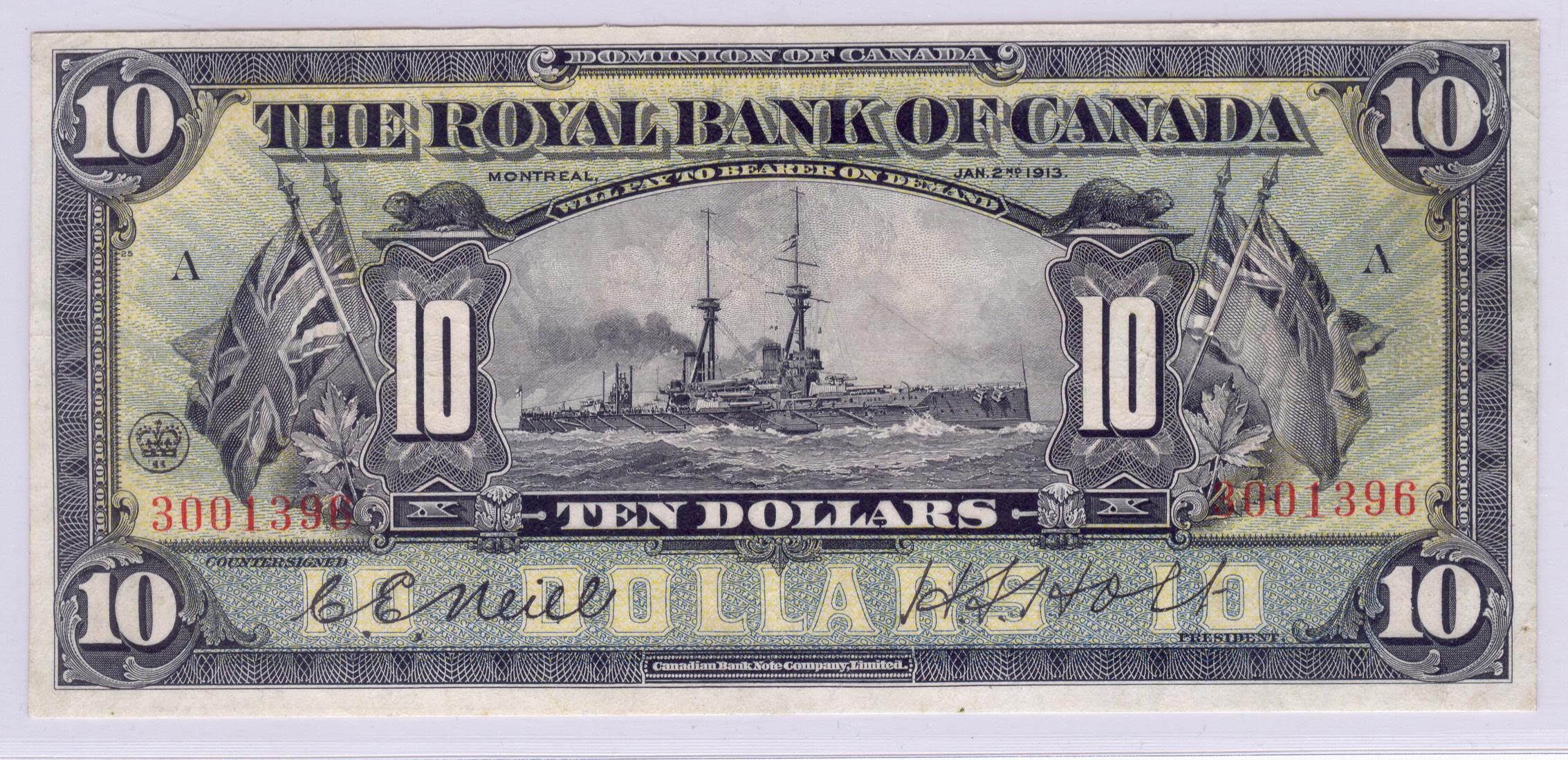 1913 Ten Dollars Royal Bank of Canada, BCS VF-20, CH 630-12-08, Neill Holt, Letter A, serial 3001396.