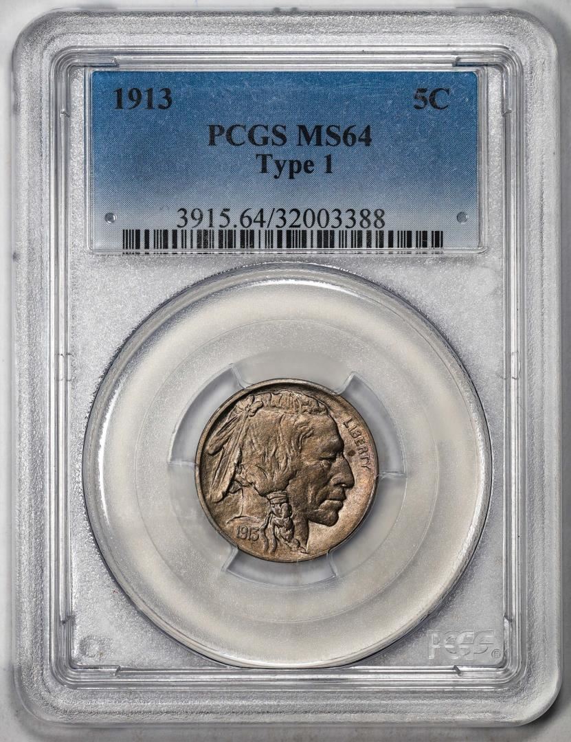 One 1913 Type 1 Buffalo Nickel Cent Coin PCGS MS64. PCGS Graded.