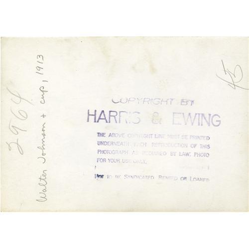 <B>1913 Walter Johnson Photograph by Harris & Ewing, Type 1.</B></I> Magnificent image captures the presentation of the Chalmers Award to the superstar Senators pitcher at the close of the 1913 season. The prize, sponsored by Detroit's Chalmers Automotive, was the first Most Valuable Player Award issued in Major League Baseball, and Johnson's stunning thirty-six and seven record, and ERA of 1.14, made him a runaway winner over second place Shoeless Joe Jackson. The Big Train looks rather sheepish here as the presenter lifts the lid of the trophy to reveal that the large cup is filled with cash. Members of the Senators and visiting Detroit Tigers look on with interest. The boldly contrasted image is the work of Washington D.C.'s most prestigious photography studio, Harris & Ewing, as stamping on verso attests. Harris & Ewing was the photographer of choice for many U.S. Presidents in the early half of the twentieth century as well. Photo measures 5x7" in size and shows only light edge and corner wear with no noteworthy condition flaws. <BR><BR><B>Important notice:</
