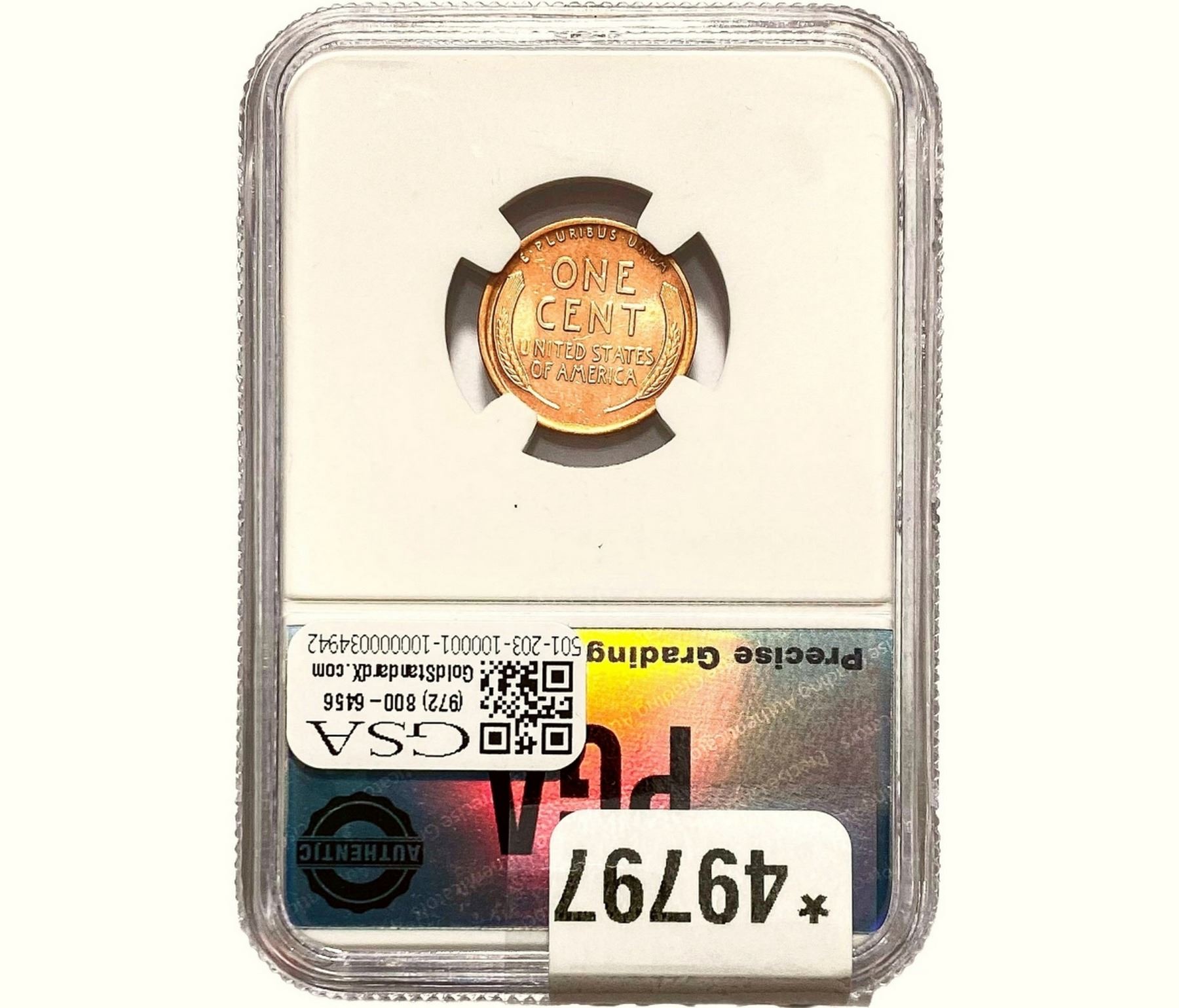 l. All non-certified coins and currency are guaranteed genuine, but are not guaranteed as to grade, since grading is a matter of opinion, an art and not a science, and therefore the description rendered by GSA or any third-party grading service may not agree with the opinion of others (including trained experts), and the same expert may not grade the same item with the same grade at two different times. GSA may, but is not obligated to, express an opinion as to non-certified numismatic items, in GSA’s opinion, or by its employees’ experience and the current interpretation of the American Numismatic Association’s standards as of the date the catalog was prepared. There is no guarantee or warranty expressed or implied that the grading opinions utilized by GSA, if any, will meet the standards of any grading service at any time in the future.