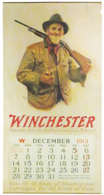 1913 Winchester Repeating Arms Co. Calendar. Depicting "Mike" by artist Robt, Robinson. American Litho Co. Original bands top and bottom, Dec page only. Small paper loss at top right and a couple of perimeter tears. 15 1/2 X 30 inches.
