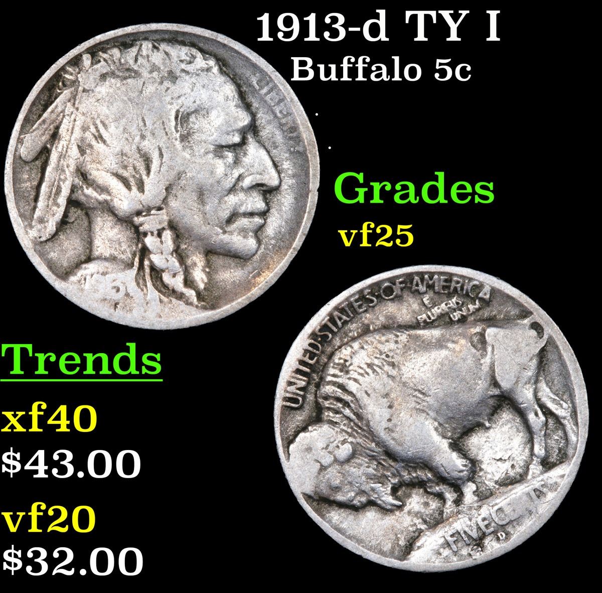 1913-d TY I . . Buffalo Nickel 5c Grades vf+.