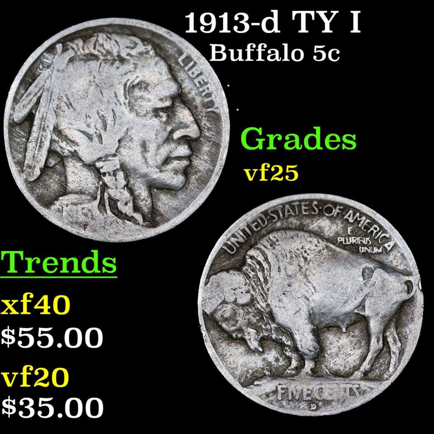 1913-d TY I Buffalo Nickel 5c Grades vf+.