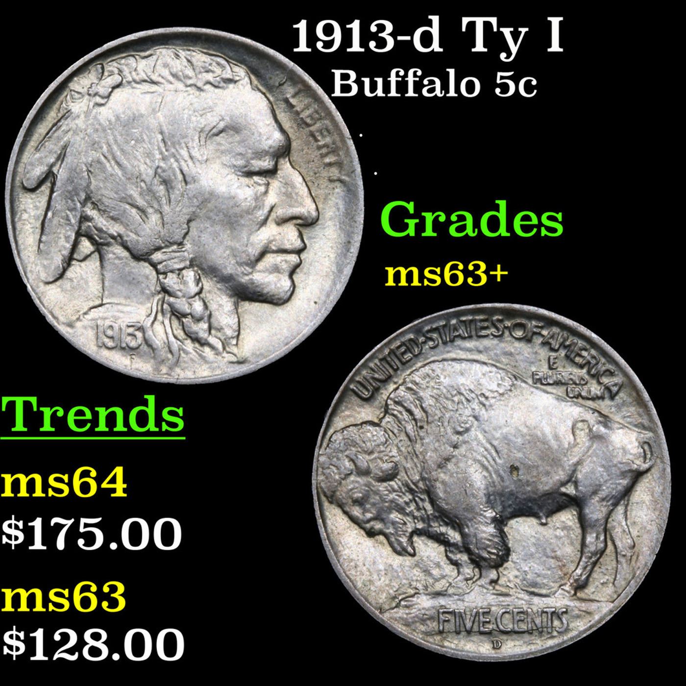 1913-d Ty I Buffalo Nickel 5c Grades Select+ Unc.