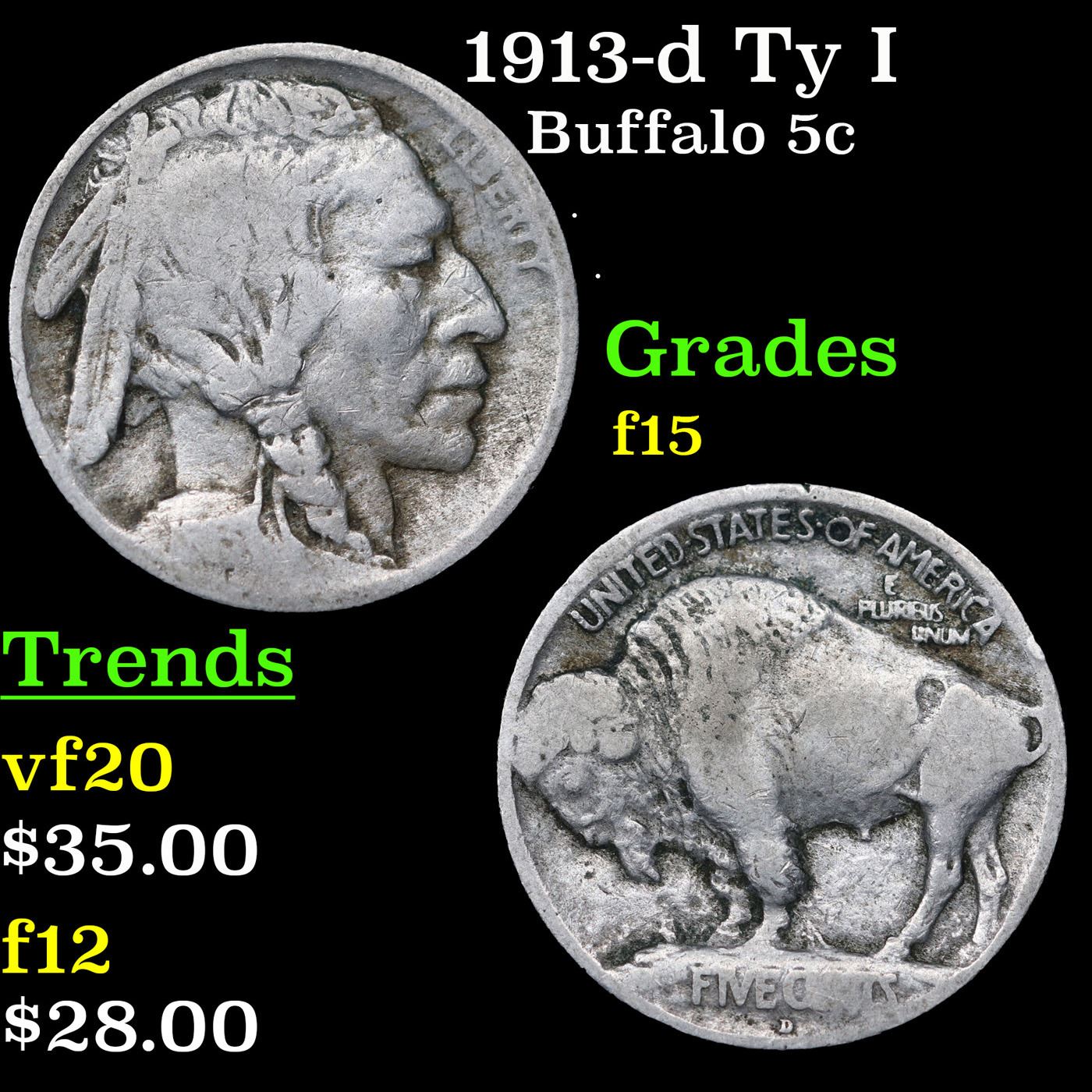 1913-d Ty I Buffalo Nickel 5c Grades f+.