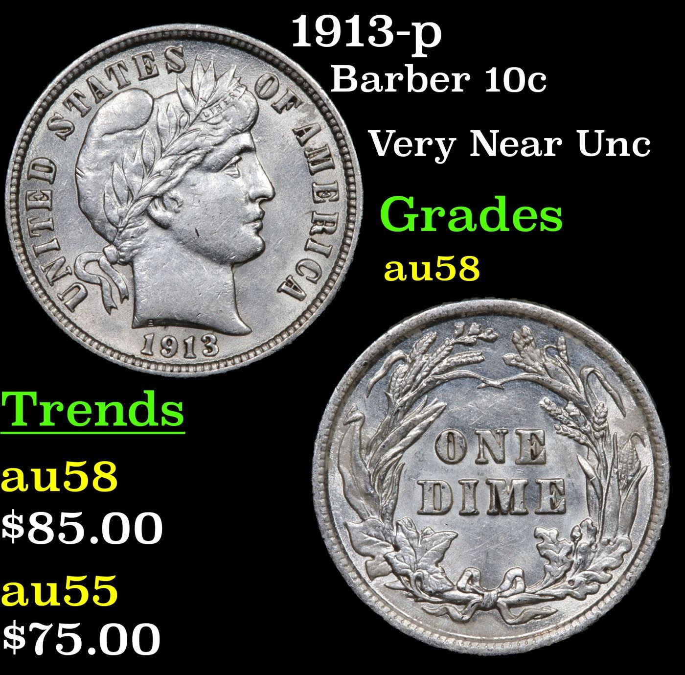 1913-p Barber Dime 10c Grades Choice AU/BU Slider.