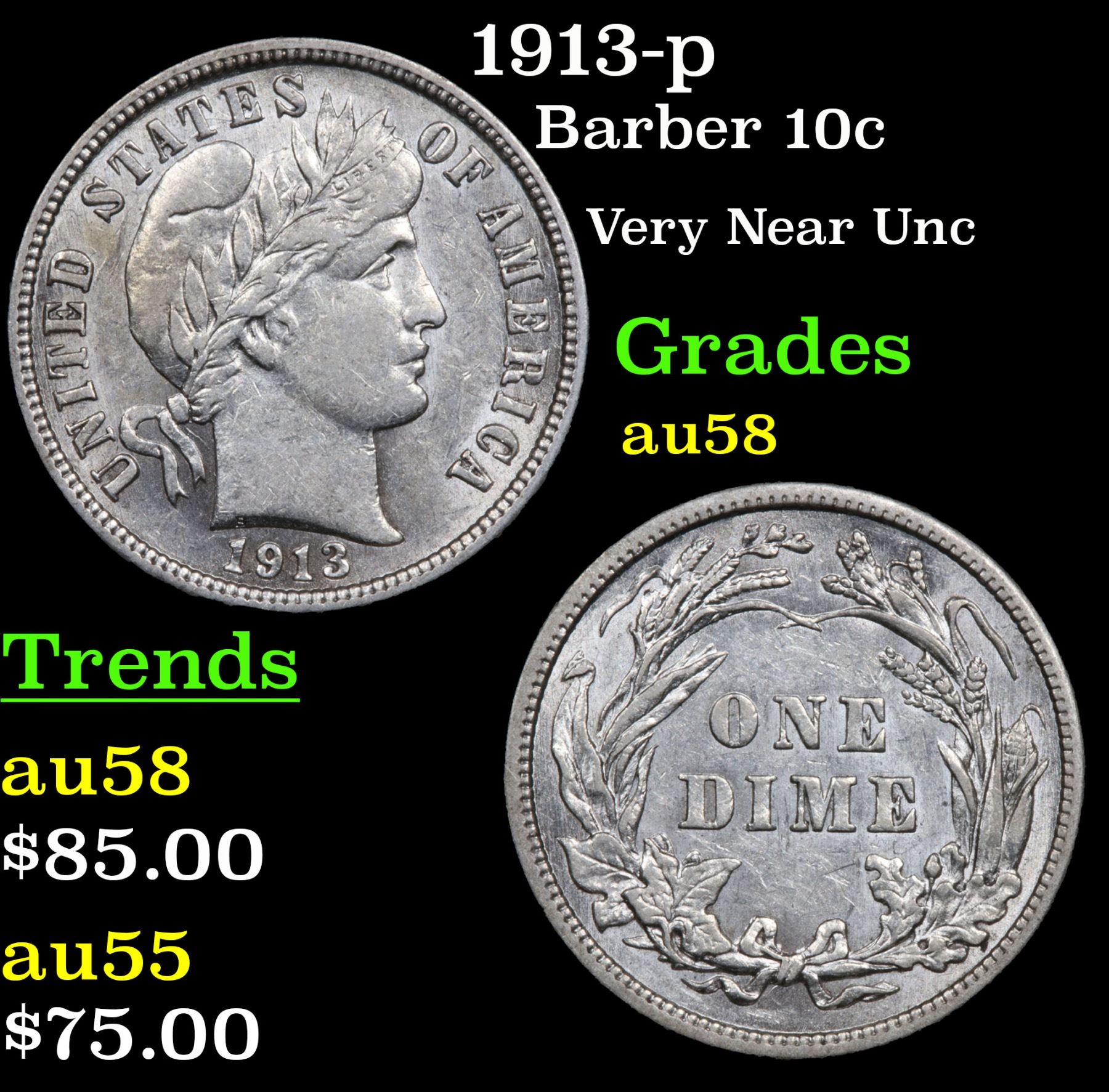1913-p Barber Dime 10c Grades Choice AU/BU Slider.