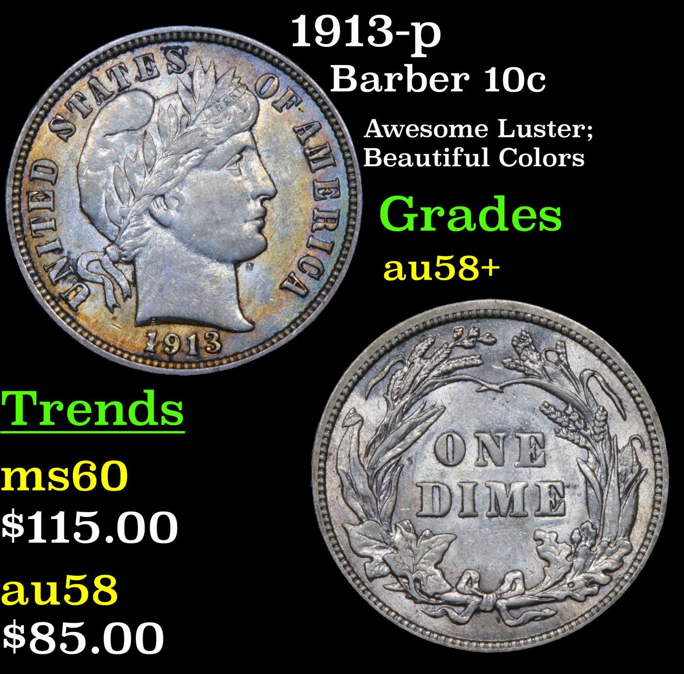 1913-p Barber Dime 10c Grades Choice AU/BU Slider+.