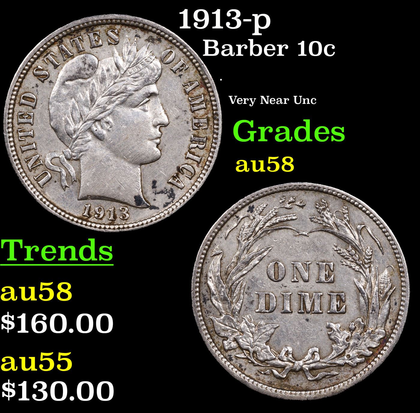 1913-p Barber Dime 10c Grades Choice AU/BU Slider.