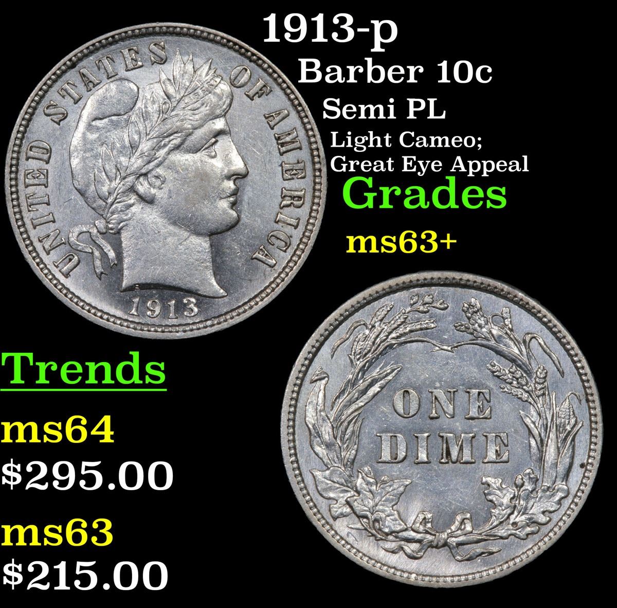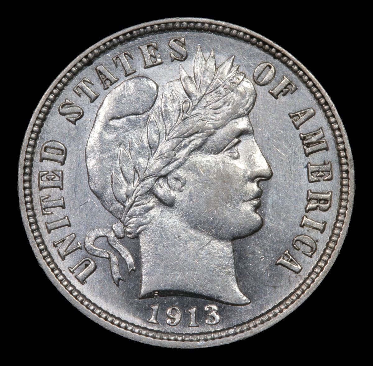 1913-p Semi PL Light Cameo; Great Eye Appeal Barber Dime 10c Grades Select+ Unc.