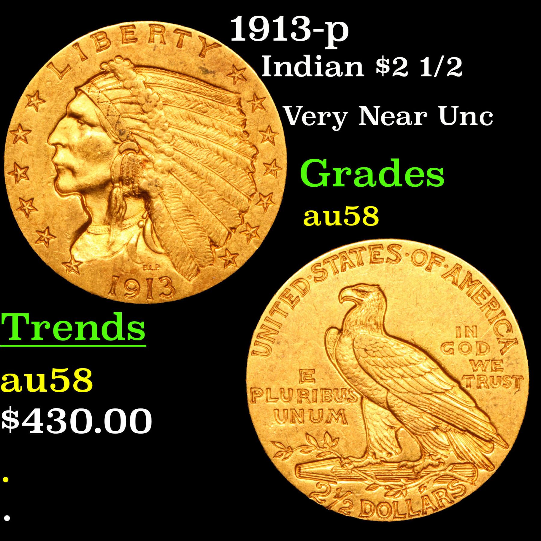 1913-p Gold Indian Quarter Eagle $2 1/2 Grades Choice AU/BU Slider.