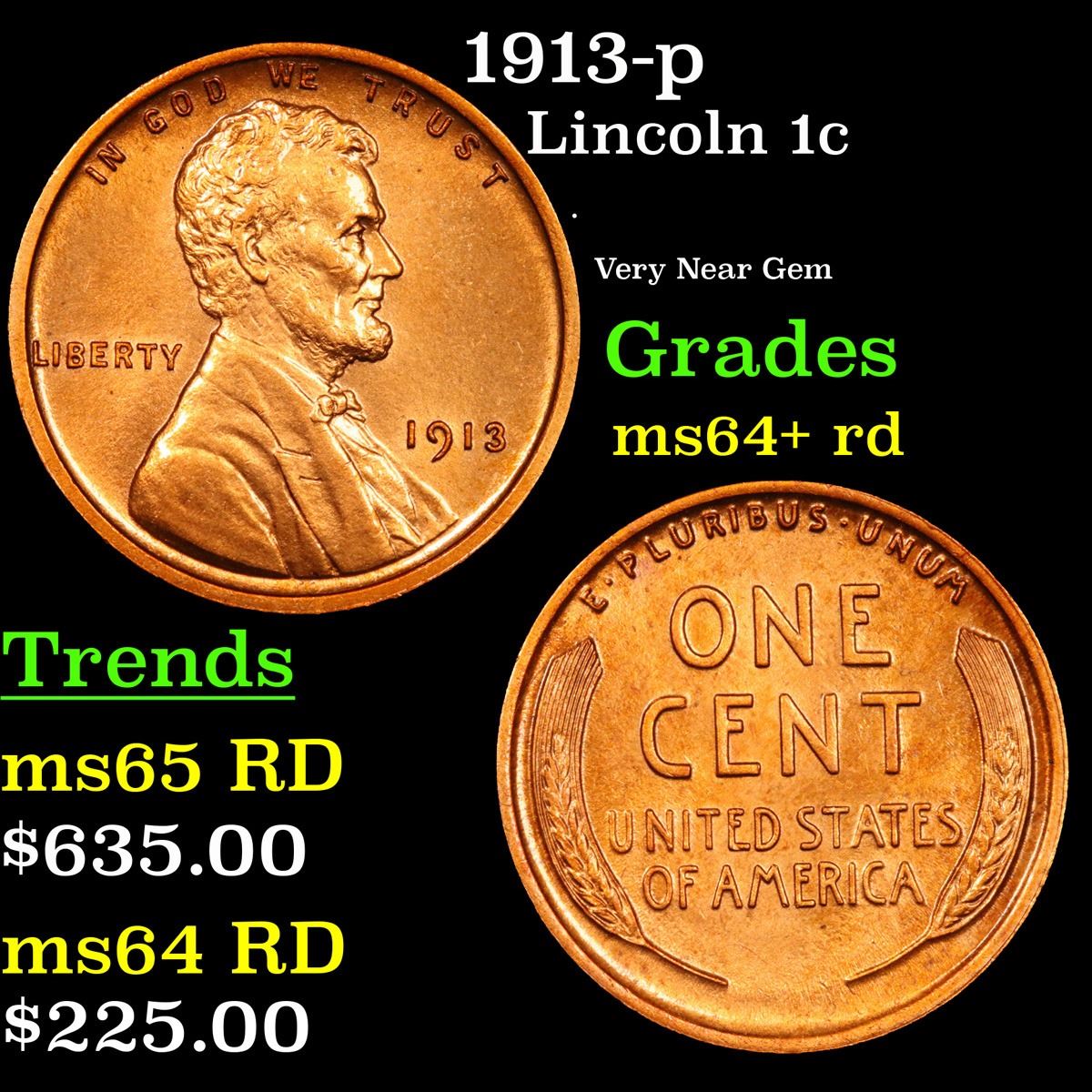 1913-p . Very Near Gem Lincoln Cent 1c Grades Choice+ Unc RD.