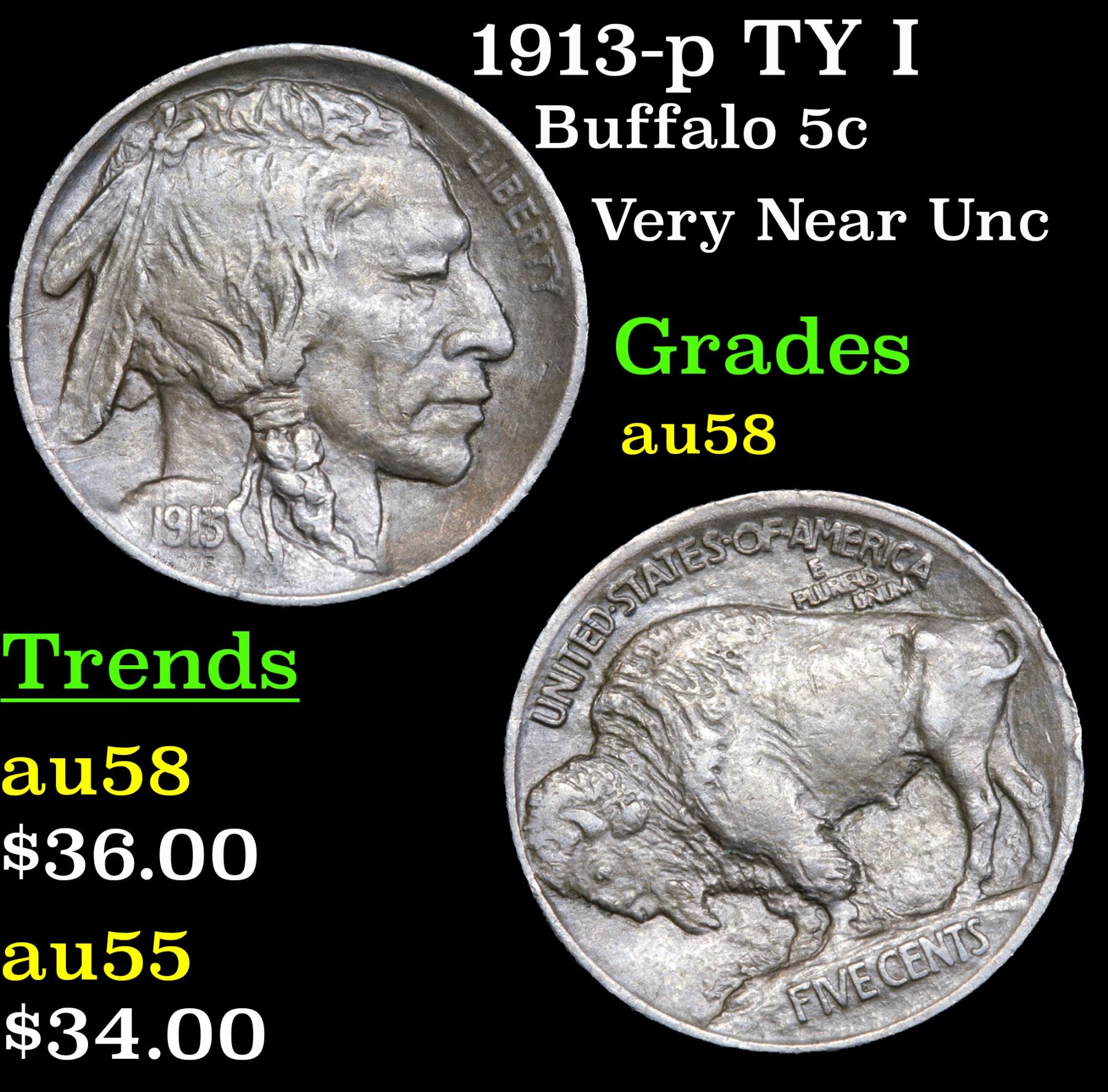 1913-p TY I . Very Near Unc Buffalo Nickel 5c Grades Choice AU/BU Slider.