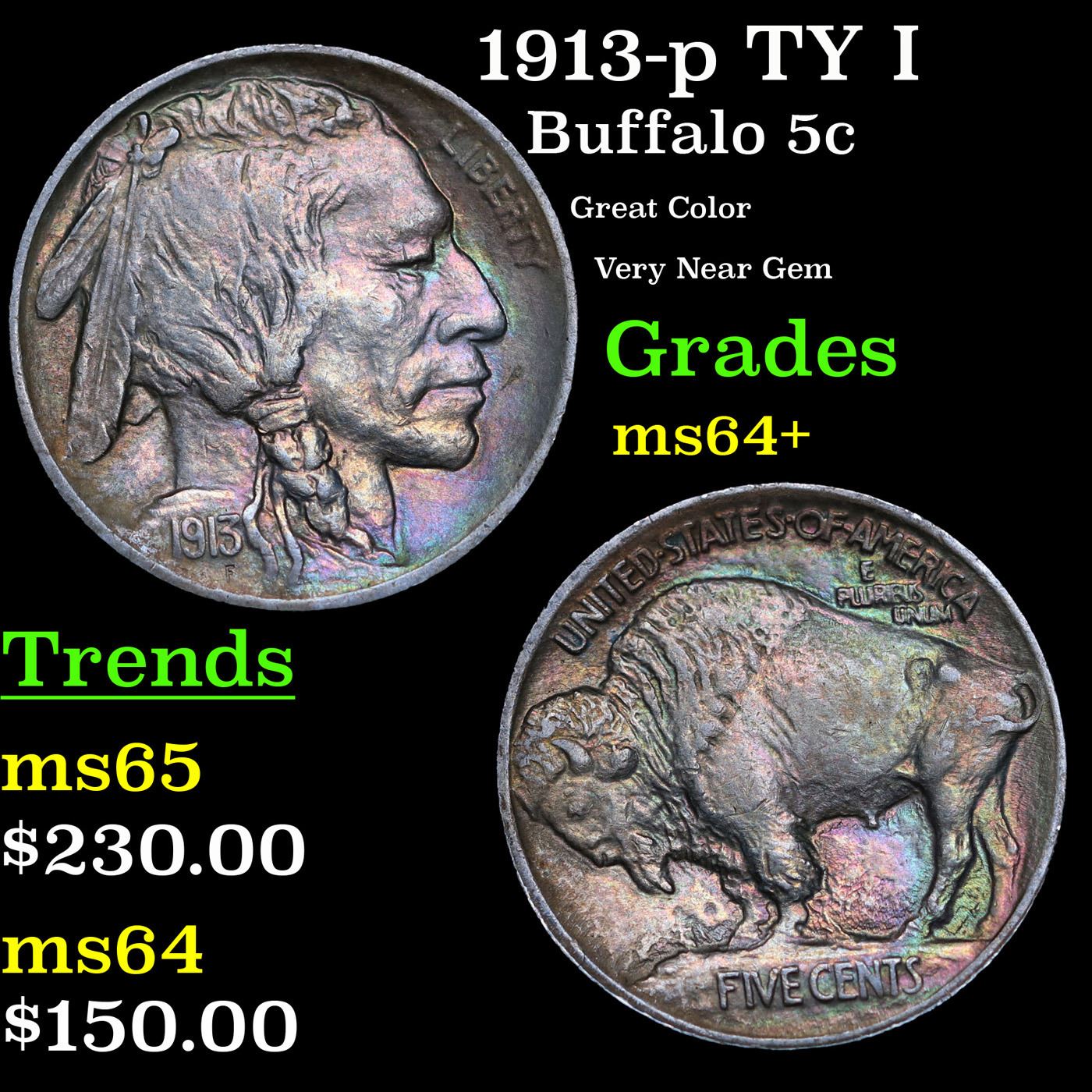 1913-p TY I Buffalo Nickel 5c Grades Choice+ Unc.
